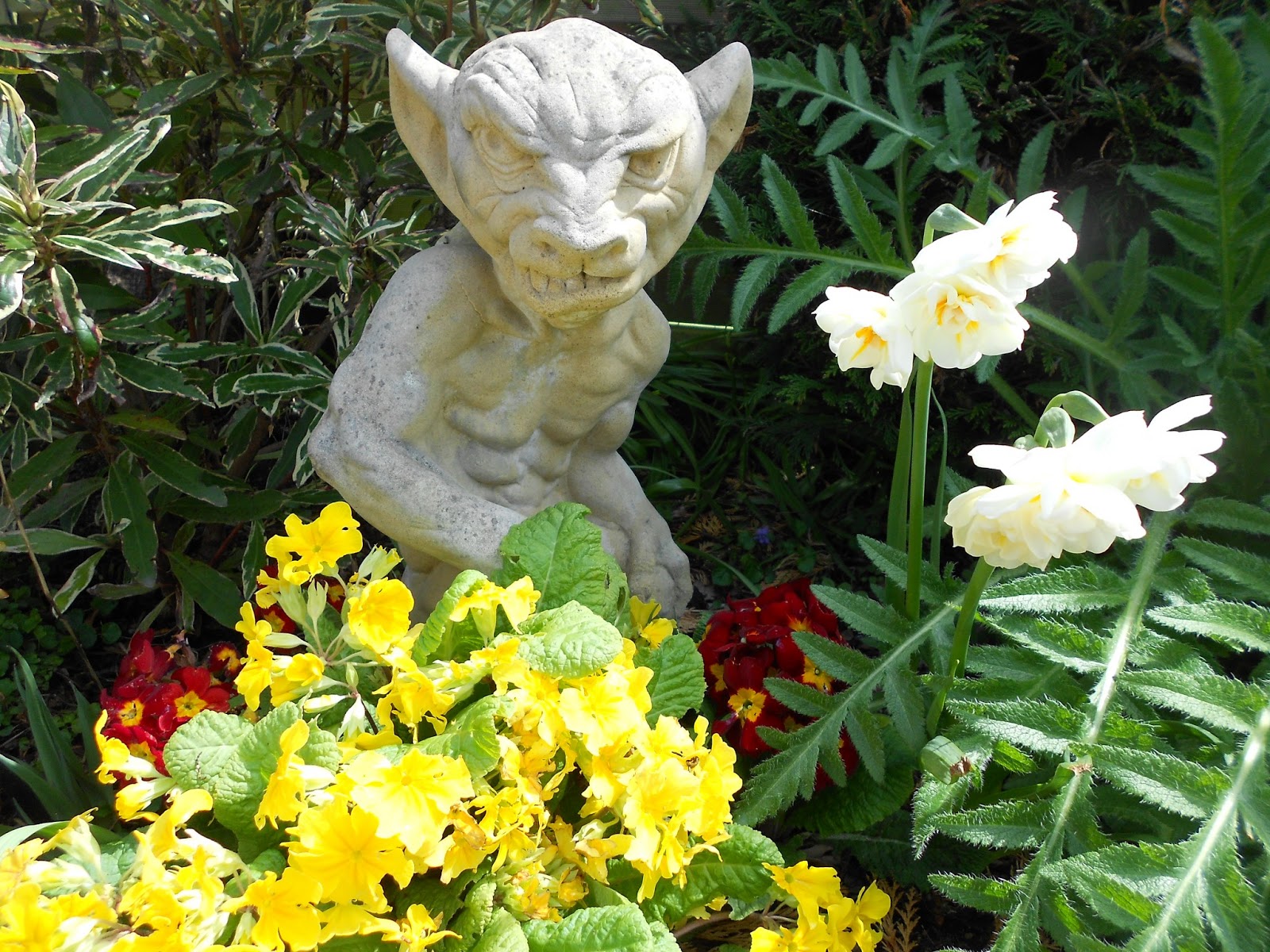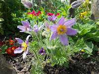 Half way to the weekend all ready thank goodness. Hope you all had a brilliant bank holiday and for once the weather for most was good I think. We celebrated James' birthday on Monday and we decided to go on the train to Dumfries for the day. It was Alfies first time on a train and he loved it, as you can see he enjoyed watching the world go by out of the window. However, we must have picked the coldest place in Britain as it was absolutely freezing!! What a change yesterday though. We had glorious sunshine and temperatures up to 24. So I got out in the garden and took some pictures. I thought you might like to see some. This one is of Steve our gremlin. He hides in the border but is quite harmless.