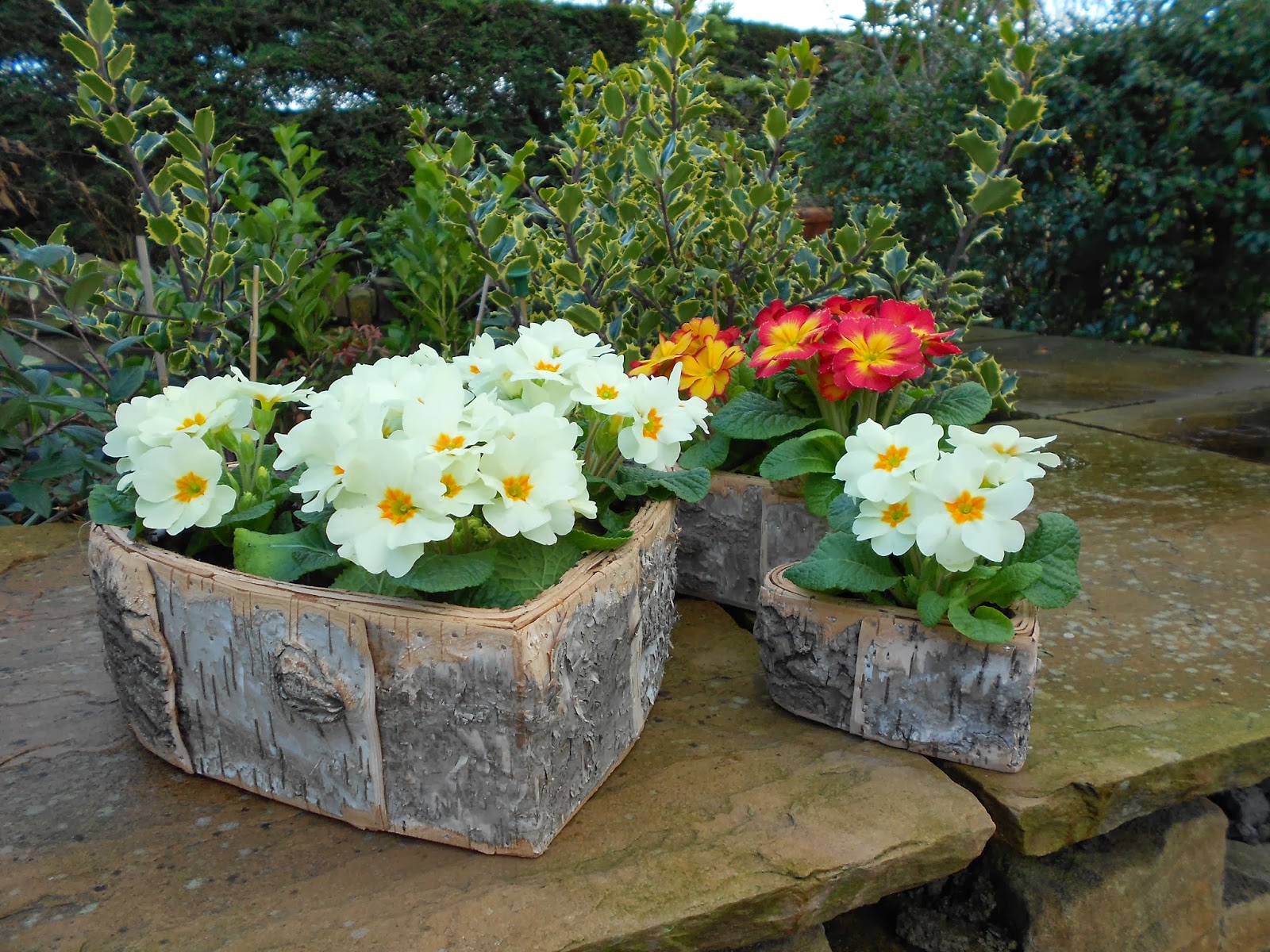 They come in a set of three and are made from silver birch wood and lined with plastic. You simply have to decide what flowers to put in them. Personally I don't think you can beat these beautiful polyanthus for bringing a bit of colour to your garden at this time of year.