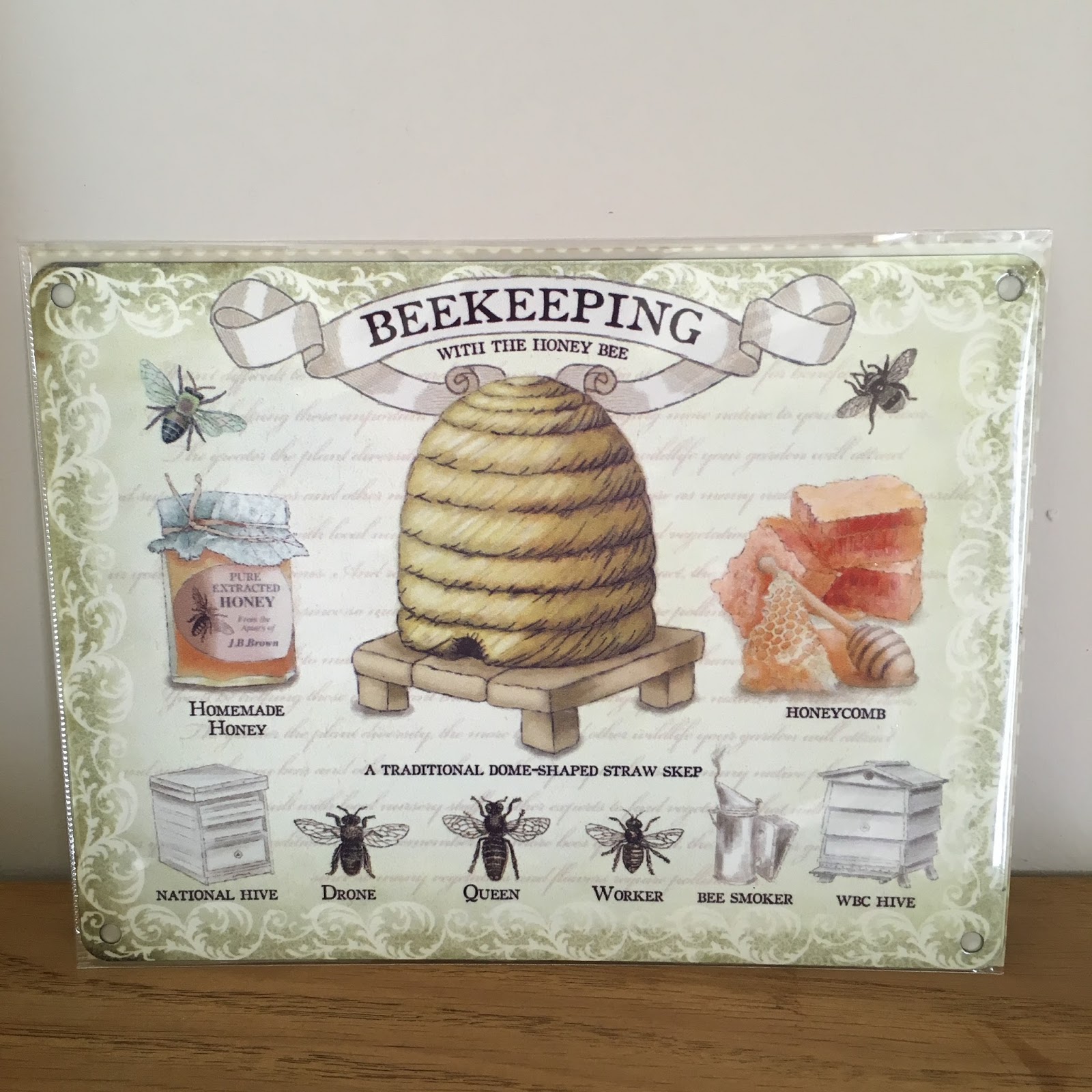 http://www.ruddickgardengifts.co.uk/gardening-gifts-c1/garden-plaques-c14/small-beekeeping-metal-wall-sign-p338