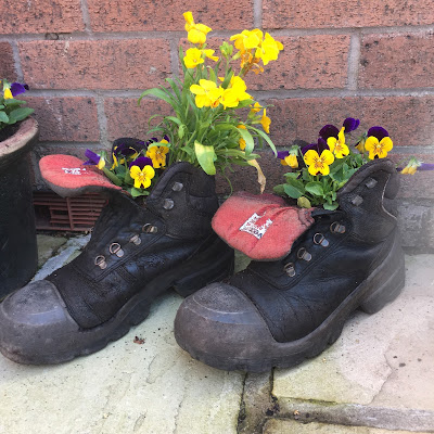 Love this one made using a pair of hubby's old work boots. The violas and wall flowers really brighten the place up. More NEW PRODUCTS have also been arriving so why not take a look at www.ruddickgardengifts.co.uk